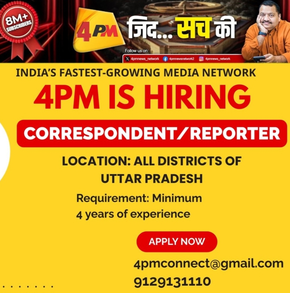 लखनऊ। उत्तर प्रदेश के पत्रकारों के लिए एक बड़ा अवसर सामने आया है। देश के तेजी से उभरते डिजिटल मीडिया नेटवर्क 4PM ने प्रदेश के सभी जिलों में ग्राउंड रिपोर्टर्स/संवाददाताओं की भर्ती प्रक्रिया शुरू की है।