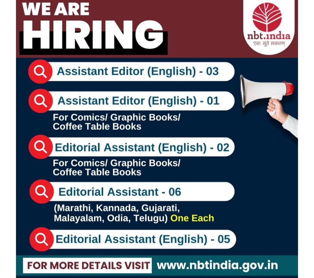 सरकारी प्रकाशन संस्था National Book Trust India (NBT) ने विभिन्न संपादकीय पदों पर भर्ती का ऐलान किया है। जारी नोटिफिकेशन के अनुसार, असिस्टेंट एडिटर और एडिटोरियल असिस्टेंट समेत कई पदों पर नियुक्तियां की जाएंगी।