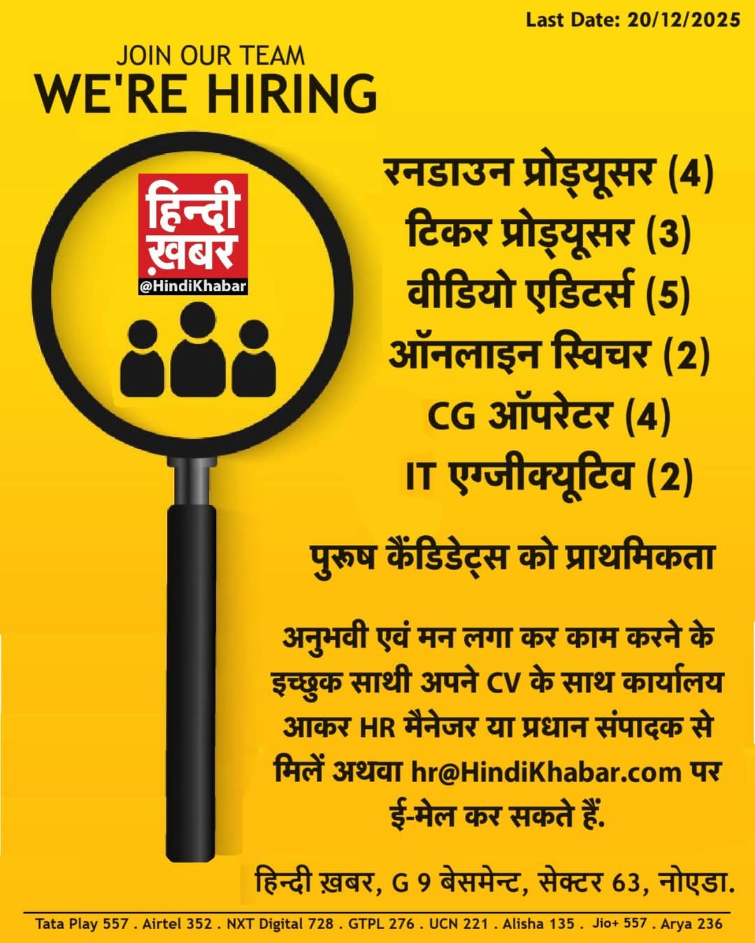 अनुभवी व मन लगाकर काम करने वाले पत्रकार साथी अपने सीवी के साथ कार्यालय आकर एच आर मैनेजर या प्रधान संपादक अतुल अग्रवाल जी मिल सकते हैं या hr@hindikhabar.com पर अपना रिज्यूम ईमेल कर सकते हैं