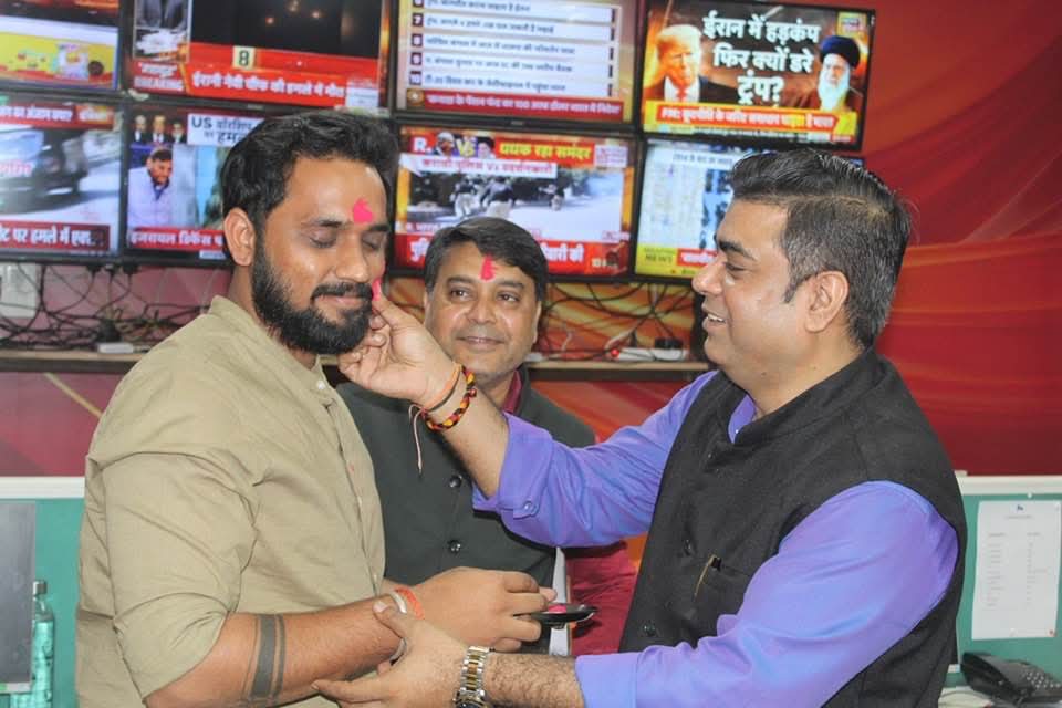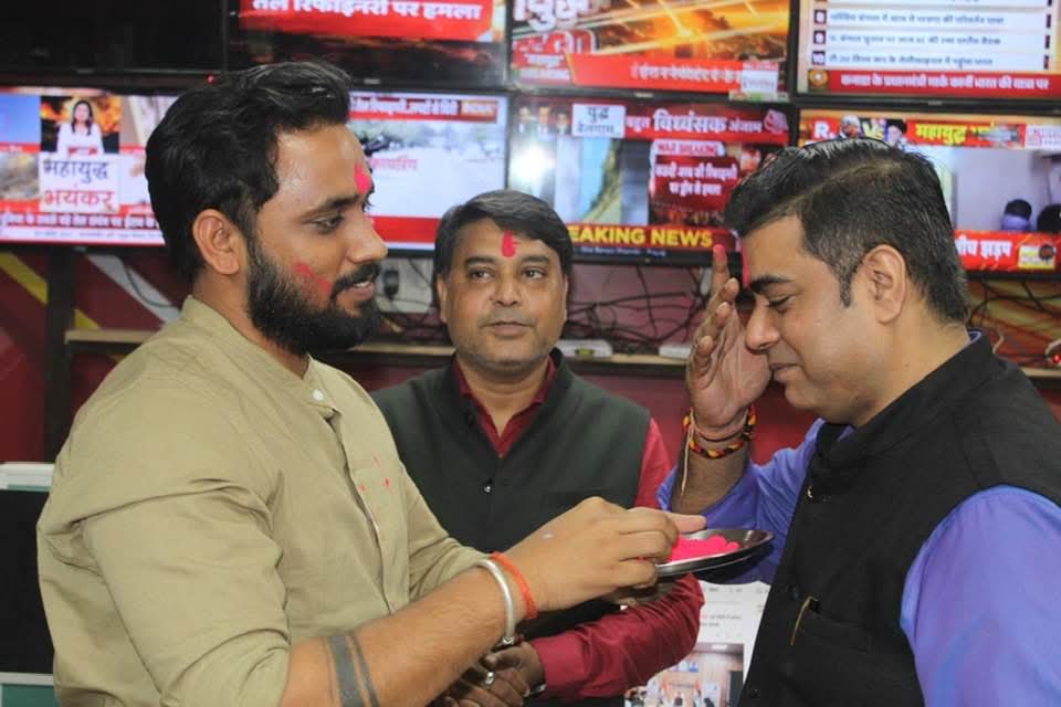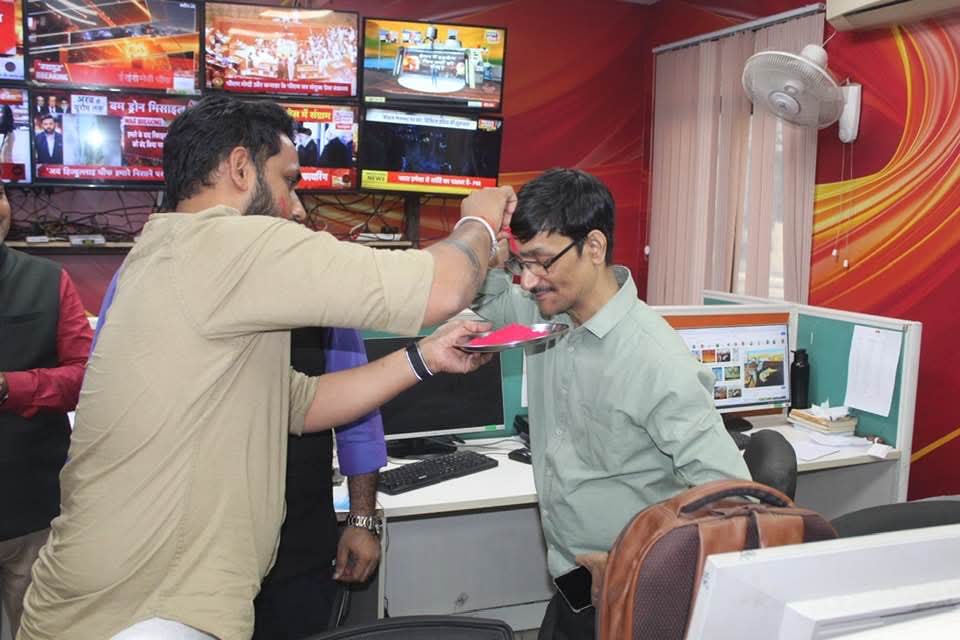 गुलाल से स्वागत: चैनल के पत्रकारों ने संस्थान के एमडी विवेक पाठक, चेयरमैन और मैनेजिंग एडिटर को गुलाल लगाकर आशीर्वाद और शुभकामनाएं लीं।