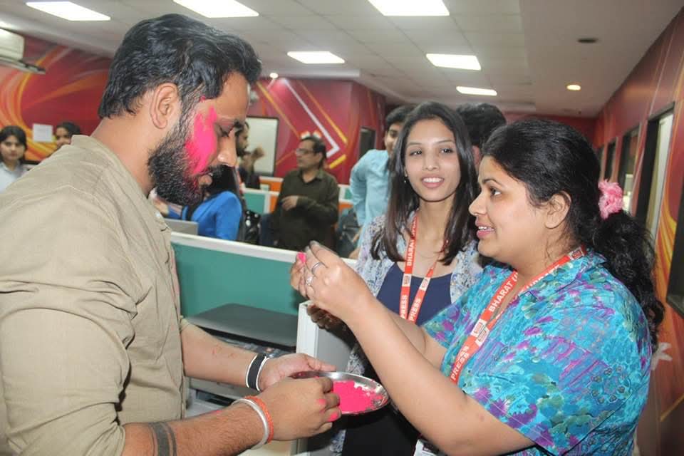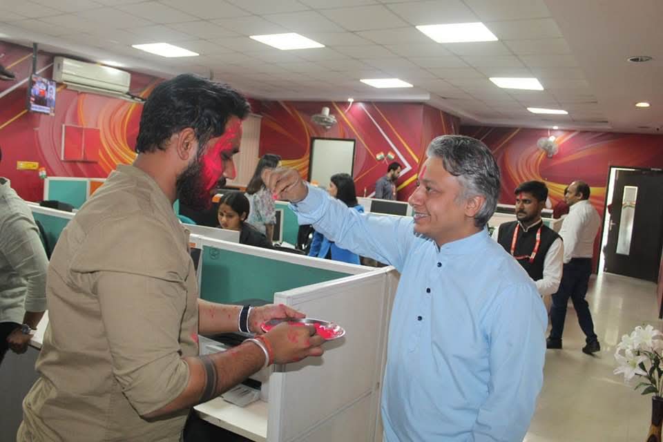 नोएडा ऑफिस में उल्लास: काम के दबाव के बीच नोएडा कार्यालय में सभी कर्मियों ने एक-दूसरे को रंग लगाकर एकता और टीम भावना का परिचय दिया।