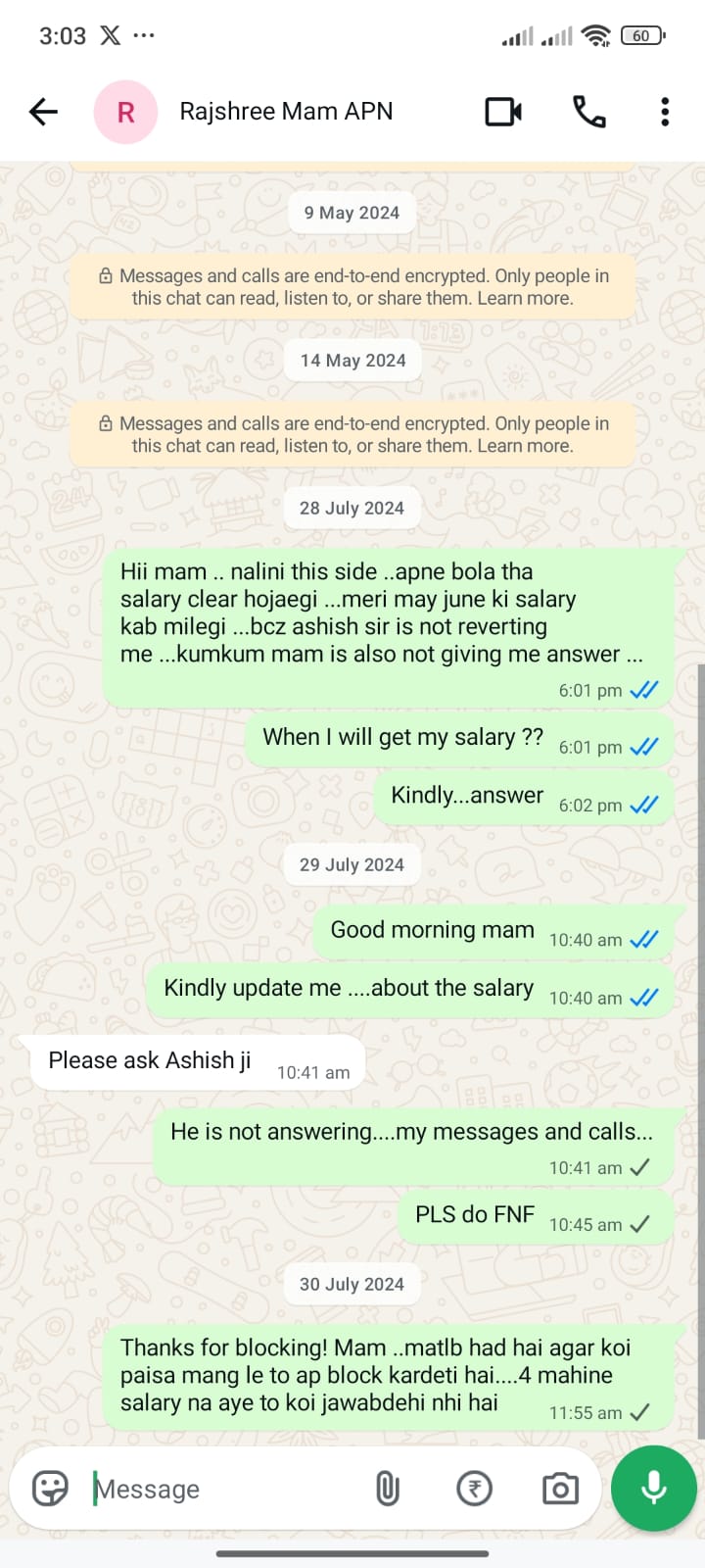 नलिनी, जो वर्तमान में 9 महीने की गर्भवती हैं, पिछले कई महीनों से नोएडा के लेबर कमिश्नर ऑफिस के चक्कर काट रही हैं। उनका मीडिया4समाचार से कॉल पर हुई बातचीत में आरोप है कि संस्थान ने उनके 3 महीने का वेतन रोक रखा है। नलिनी बताती हैं, “मैंने निष्ठा से काम किया, लेकिन जब वेतन माँगा तो MD राजश्री राय ने मुझे सोशल मीडिया और व्हाट्सएप से ब्लॉक कर दिया। आज मुझे पैसों की सख्त जरूरत है लेकिन सुनवाई कहीं नहीं हो रही।”