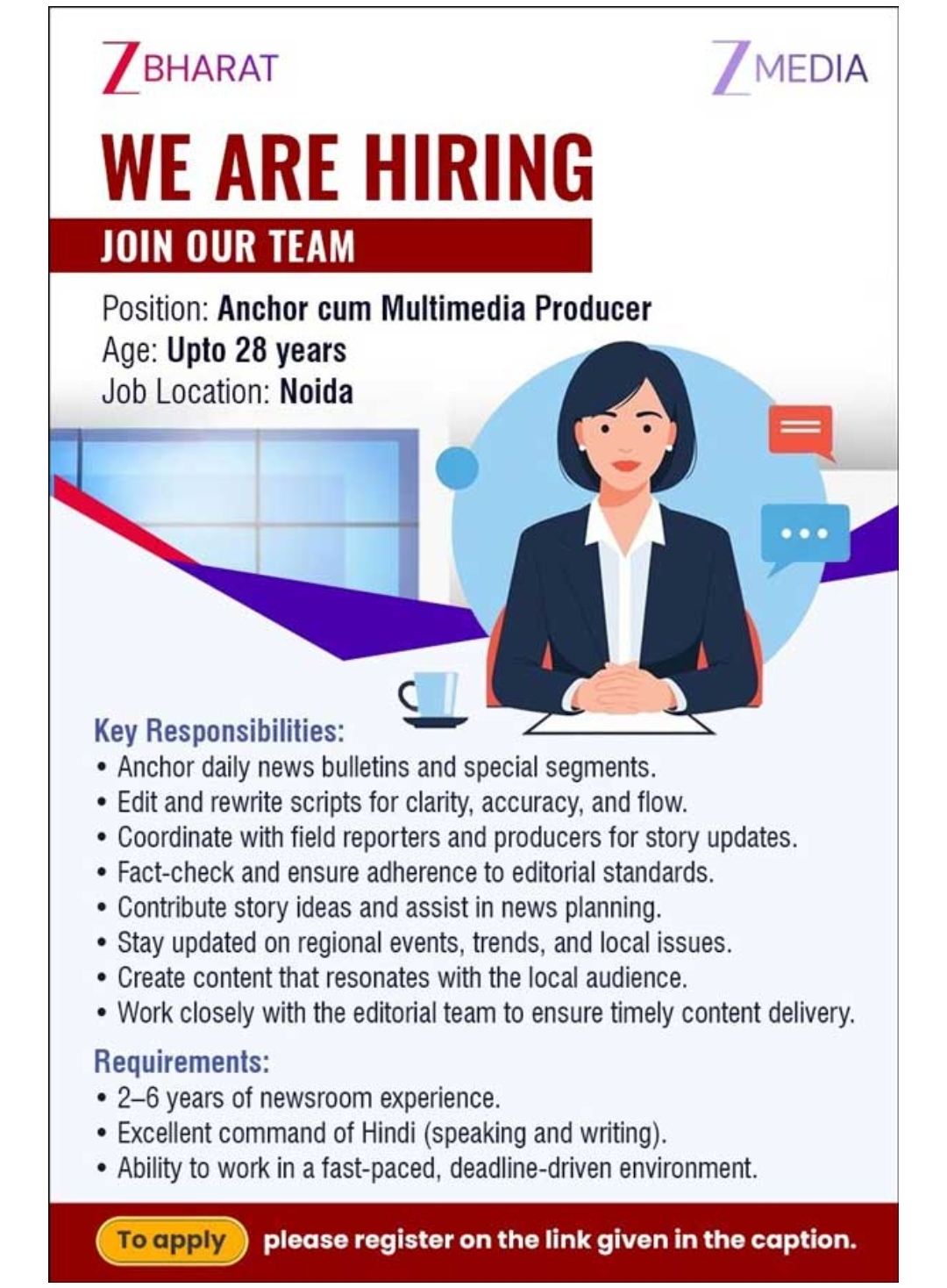 सोशल मीडिया पर शेयर किए गए विज्ञापन के अनुसार, उम्मीदवार को तेज गति वाले न्यूजरूम माहौल में काम करने की क्षमता और स्थानीय मुद्दों व ट्रेंड्स की समझ भी होनी चाहिए।