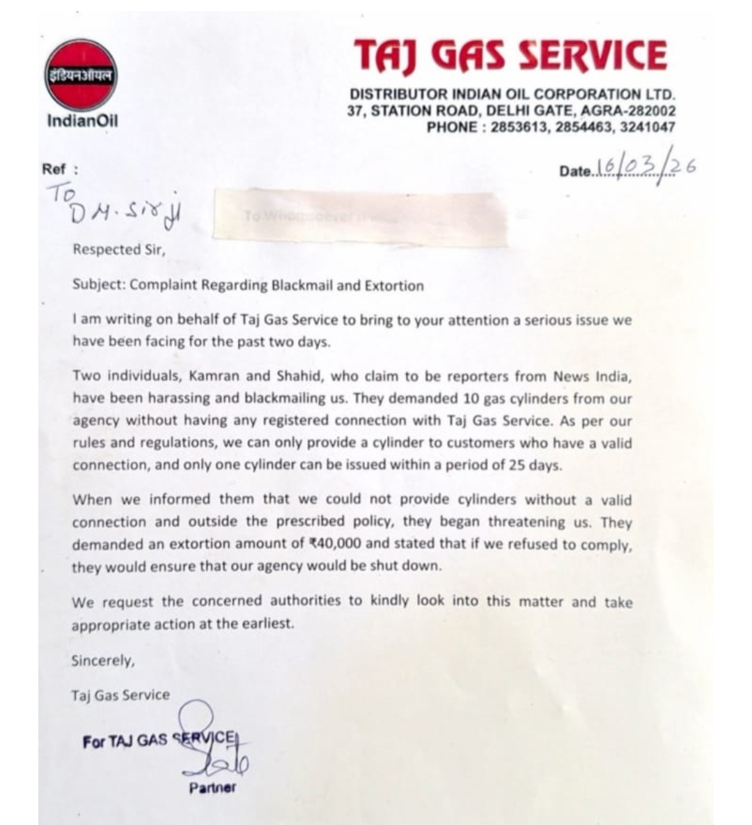 ताजगंज स्थित ताज गैस सर्विस (Taj Gas Service) ने जिला प्रशासन को सौंपे गए अपने शिकायती पत्र में आरोप लगाया कि कमरान और शाहिद नाम के दो व्यक्ति पिछले दो दिनों से एजेंसी पर अनुचित दबाव बना रहे थे। ये दोनों खुद को “News India” चैनल का प्रतिनिधि बता रहे थे।