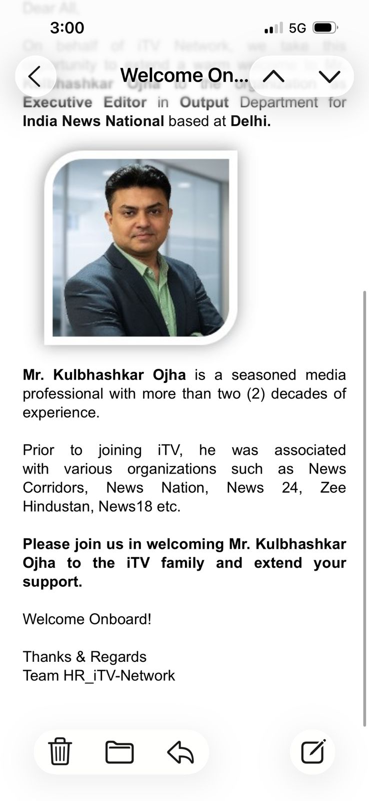 “हम कुलभाष्कर ओझा का iTV परिवार में स्वागत करते हैं और सभी सहयोगियों से उनके लिए पूरा समर्थन देने की अपेक्षा करते हैं। Welcome Onboard!”
