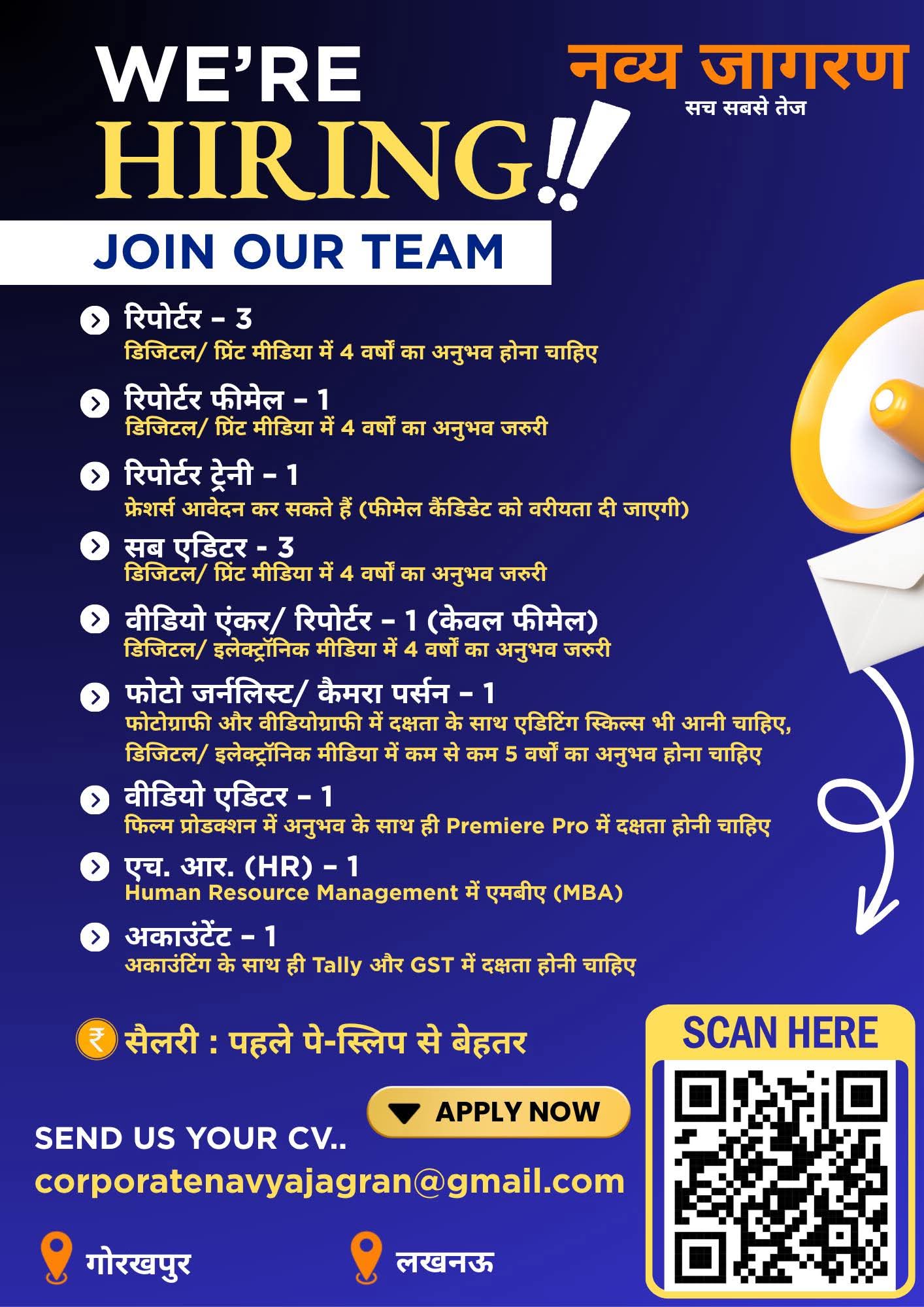 गोरखपुर । अगर आपके अंदर पत्रकारिता का जुनून है, सच बोलने और लिखने का साहस है, और समाज की समस्याएं आपको झकझोरती हैं—तो यह अवसर आपके लिए है। गोरखपुर से प्रकाशित साप्ताहिक अखबार और न्यूज चैनल “नव्य जागरण (सच सबसे तेज)” ने पत्रकारों और अन्य पदों के लिए भर्ती प्रक्रिया शुरू की है।