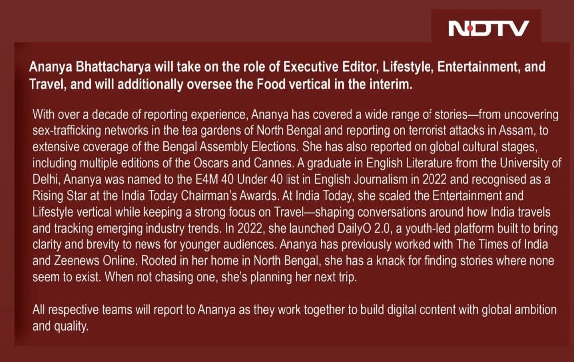 अनन्या भट्टाचार्य लाइफस्टाइल, एंटरटेनमेंट और ट्रैवल के लिए एक्जीक्यूटिव एडिटर की भूमिका संभालेंगी। साथ ही, वे अंतरिम रूप से फूड वर्टिकल (Food vertical) की भी देखरेख करेंगी।
