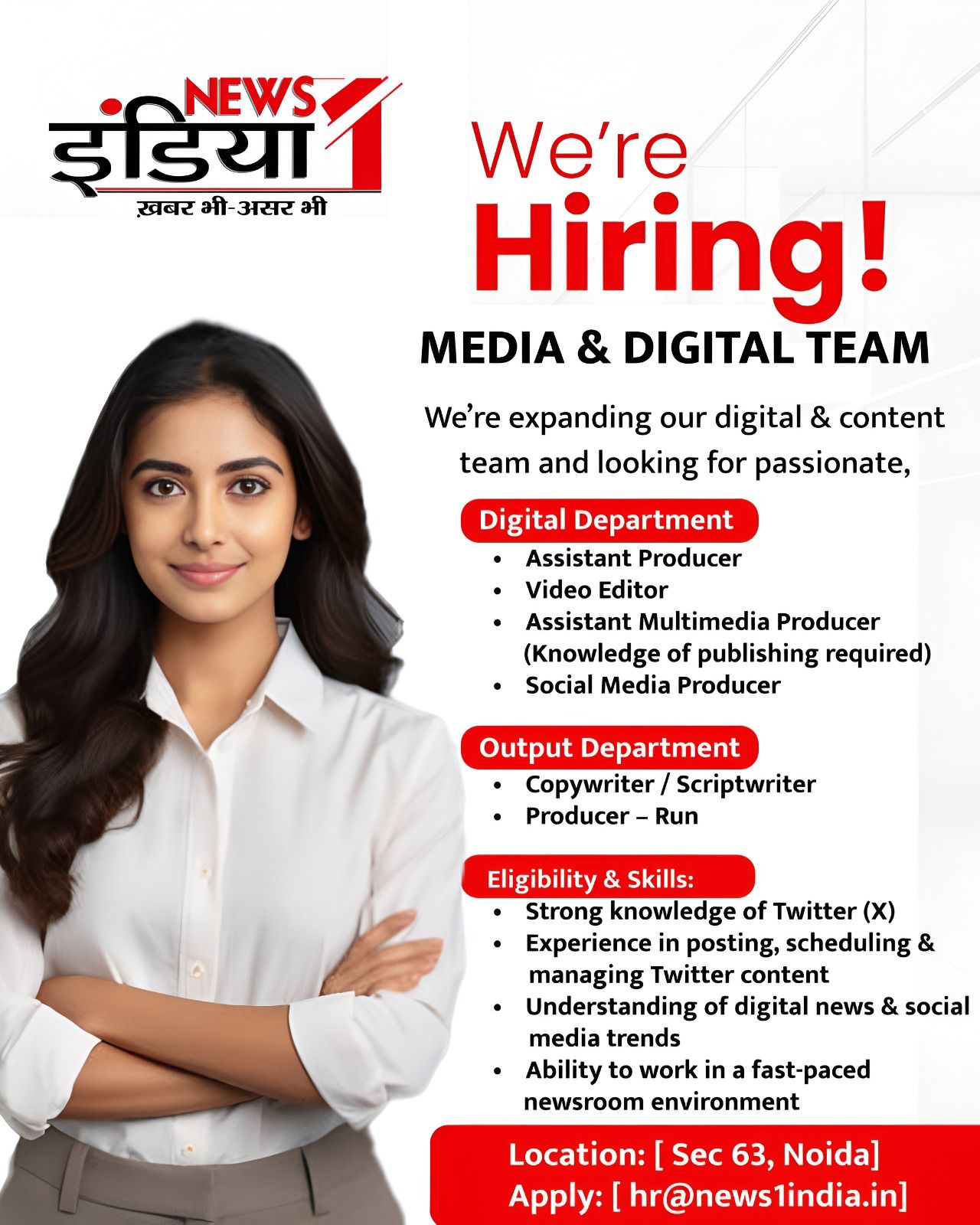 News1 India अपने डिजिटल और कंटेंट विभाग का विस्तार कर रहा है। अगर आप मीडिया की दुनिया में अपनी पहचान बनाना चाहते हैं और खबरों की रफ्तार के साथ चलने का जज्बा रखते हैं, तो हमारे नोएडा (Noida) ऑफिस के लिए आवेदन आमंत्रित हैं।