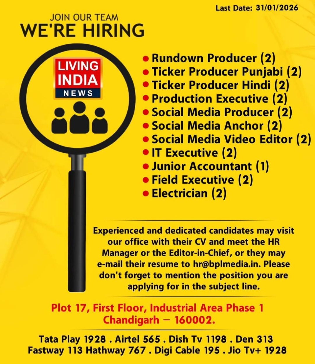 पंजाब,हरियाणा,हिमाचल के लोकप्रिय चैनल लिविंग इंडिया न्यूज चैनल को इन पदों पर योग्य अनुभवी पत्रकार चाहिए,दिए गए मेल पर आप अपना रिज्यूम भेज सकते हैं या डायरेक्ट ऑफिस आकर एडिटर इन चीफ से मीटिंग कर इंटरव्यू दे सकते हैं,विस्तृत डिटेल चैनल से जारी विज्ञापन में दी गई हैं