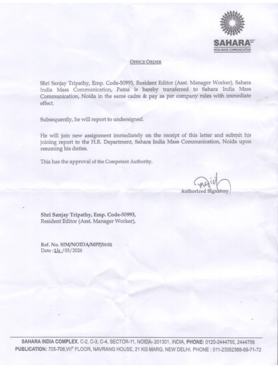 राष्ट्रीय सहारा के पटना यूनिट में बड़ा प्रशासनिक बदलाव किया गया है। संस्थान ने स्थानीय संपादक संजय त्रिपाठी का तबादला नोएडा कर दिया है। वहीं, अमर सिंह को पटना यूनिट का नया यूनिट मैनेजर नियुक्त किया गया है।