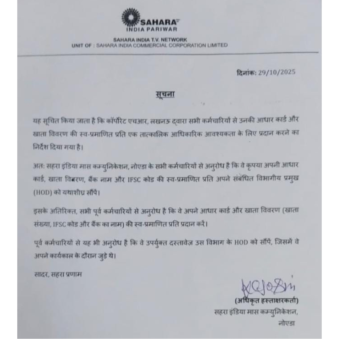 नोएडा। सहारा इंडिया परिवार से जुड़ी एक अहम जानकारी सामने आई है। सहारा इंडिया टीवी नेटवर्क की यूनिट सहारा इंडिया मास कम्युनिकेशन, नोएडा ने अपने सभी कर्मचारियों से आधार कार्ड और बैंक खाता विवरण (खाता संख्या, बैंक नाम और IFSC कोड) की स्व-प्रमाणित प्रति मांगी है।