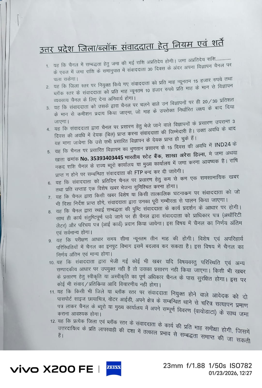दस्तावेज़ की धारा 5 में एक विशिष्ट बैंक खाता संख्या (35393403445, भारतीय स्टेट बैंक) दी गई है, जिसमें विज्ञापन की राशि जमा करने का निर्देश है। जानकारों का कहना है कि जब कोई संस्थान अपने संवाददाताओं पर हर महीने हजारों रुपये देने का दबाव बनाता है, तो वह संवाददाता अपनी जेब भरने और चैनल का टारगेट पूरा करने के लिए अवैध उगाही का रास्ता अपनाता है।