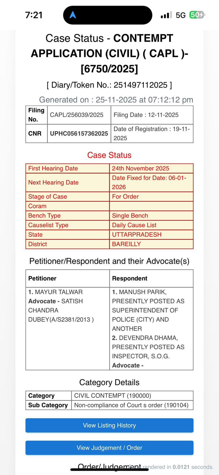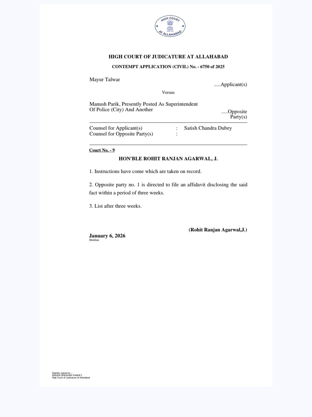 इलाहाबाद हाईकोर्ट ने बरेली के एसपी सिटी मानुष पारिख से जुड़े अवमानना मामले में सख़्त रुख अपनाते हुए तीन सप्ताह के भीतर तथ्यात्मक व्यक्तिगत हलफ़नामा दाख़िल करने का निर्देश दिया है।