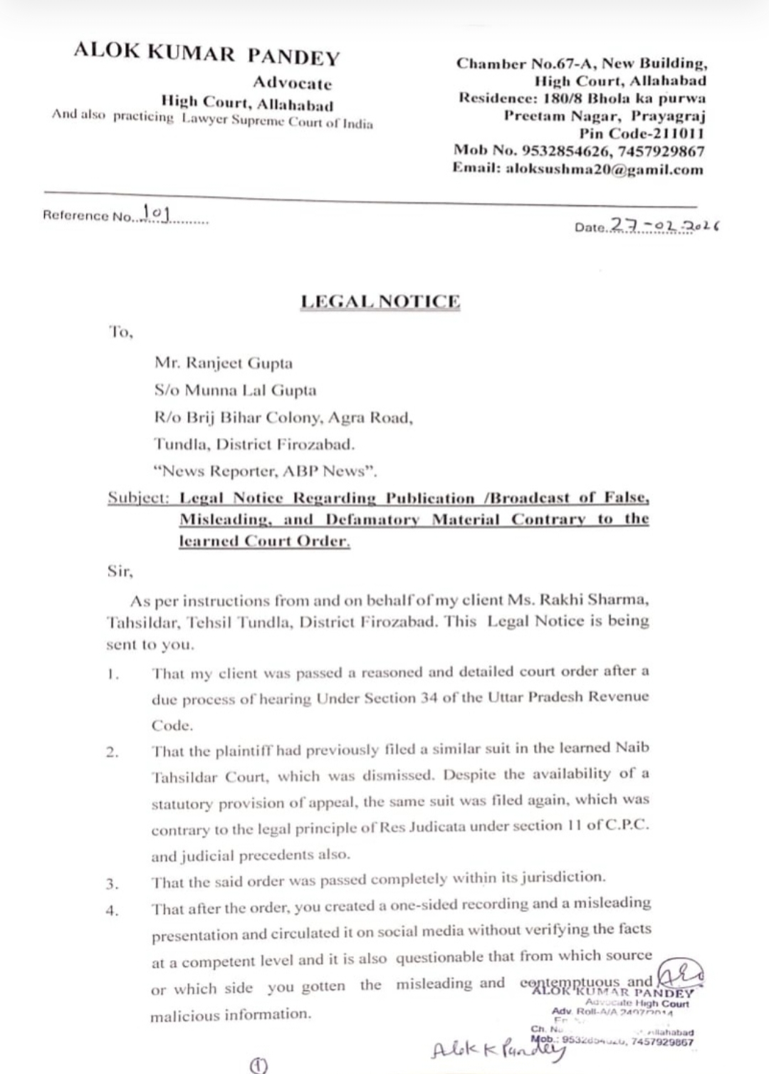 फिरोजाबाद: उत्तर प्रदेश के फिरोजाबाद में भ्रामक खबरें चलाने वालों के खिलाफ प्रशासन ने अब आर-पार की जंग छेड़ दी है। ताजा मामला टूंडला का है, जहाँ तहसीलदार राखी शर्मा ने ABP न्यूज़ के संवाददाता रंजीत गुप्ता की ‘पत्रकारिता’ पर कड़ा प्रहार करते हुए उन्हें कोर्ट के जरिए कानूनी नोटिस थमा दिया है।