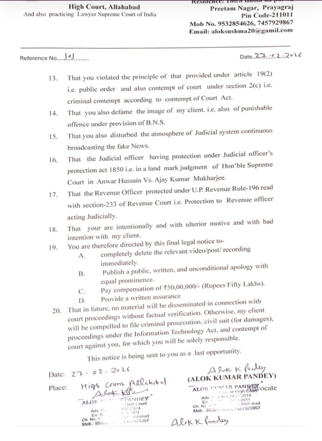 तहसीलदार राखी शर्मा ने कोर्ट के माध्यम से स्पष्ट चेतावनी दी है कि रंजीत गुप्ता को 7 कार्य दिवसों के भीतर अपना लिखित जवाब दाखिल करना होगा। नोटिस का लहजा साफ है—या तो सबूत दो, या फिर मानहानि और भ्रामक खबर फैलाने के जुर्म में गंभीर कानूनी कार्रवाई झेलने के लिए तैयार रहो। प्रशासन के इस कड़े रुख से जिले में ‘व्हाट्सएप यूनिवर्सिटी’ चलाने वाले तथाकथित खबरनवीसों के होश उड़े हुए हैं।