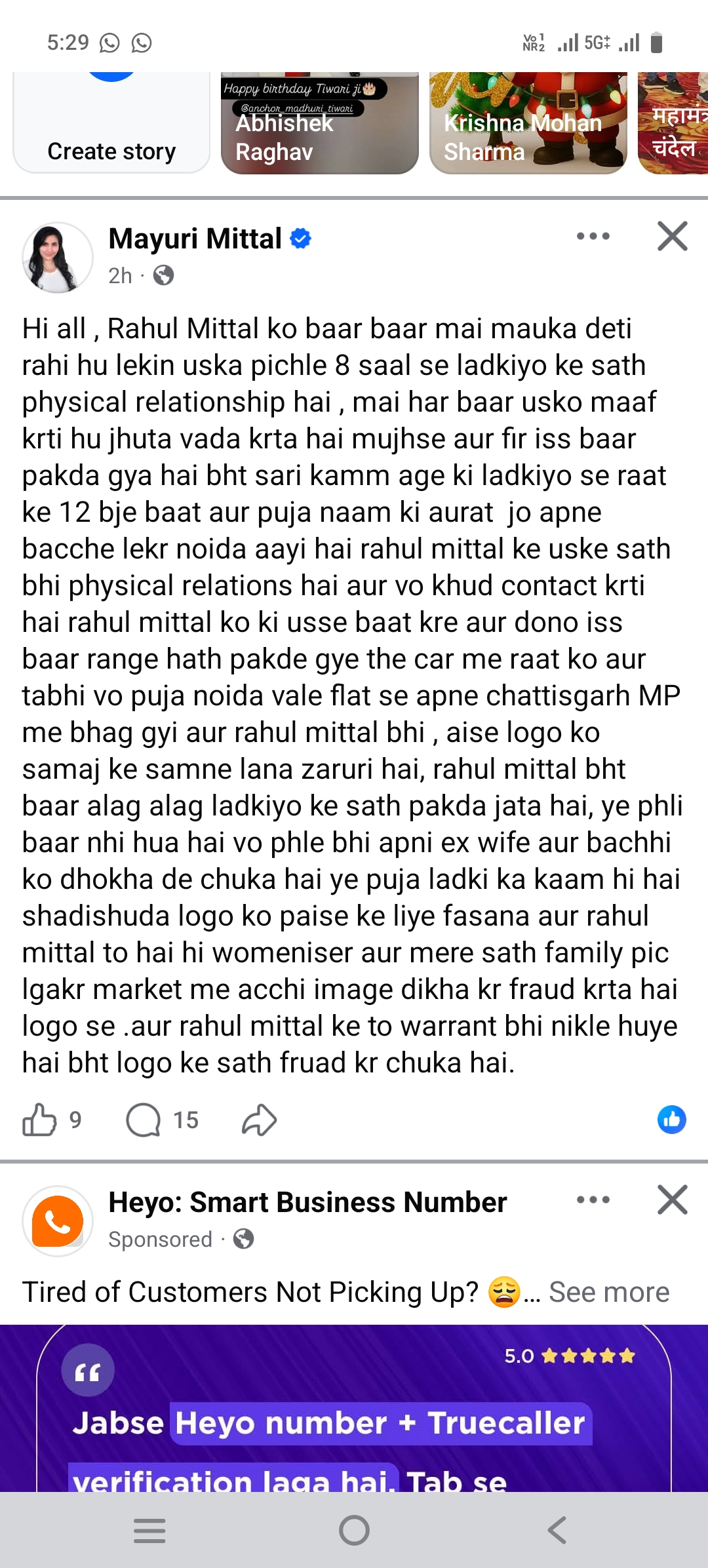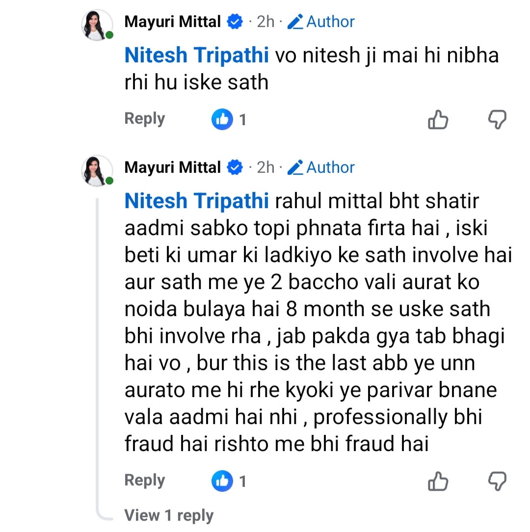 टीवी पत्रकार व नोएडा से संचालित इंडिया 7 न्यूज चैनल के चेयरमैन राहुल मित्तल की घरेलू ज़िंदगी का विवाद चौराहे पर आ चुका है। उनकी पत्नी मयूरी मित्तल ने फेसबुक पोस्ट के ज़रिए कई गंभीर आरोप लगाए हैं। देखें स्क्रीनशॉट्स-