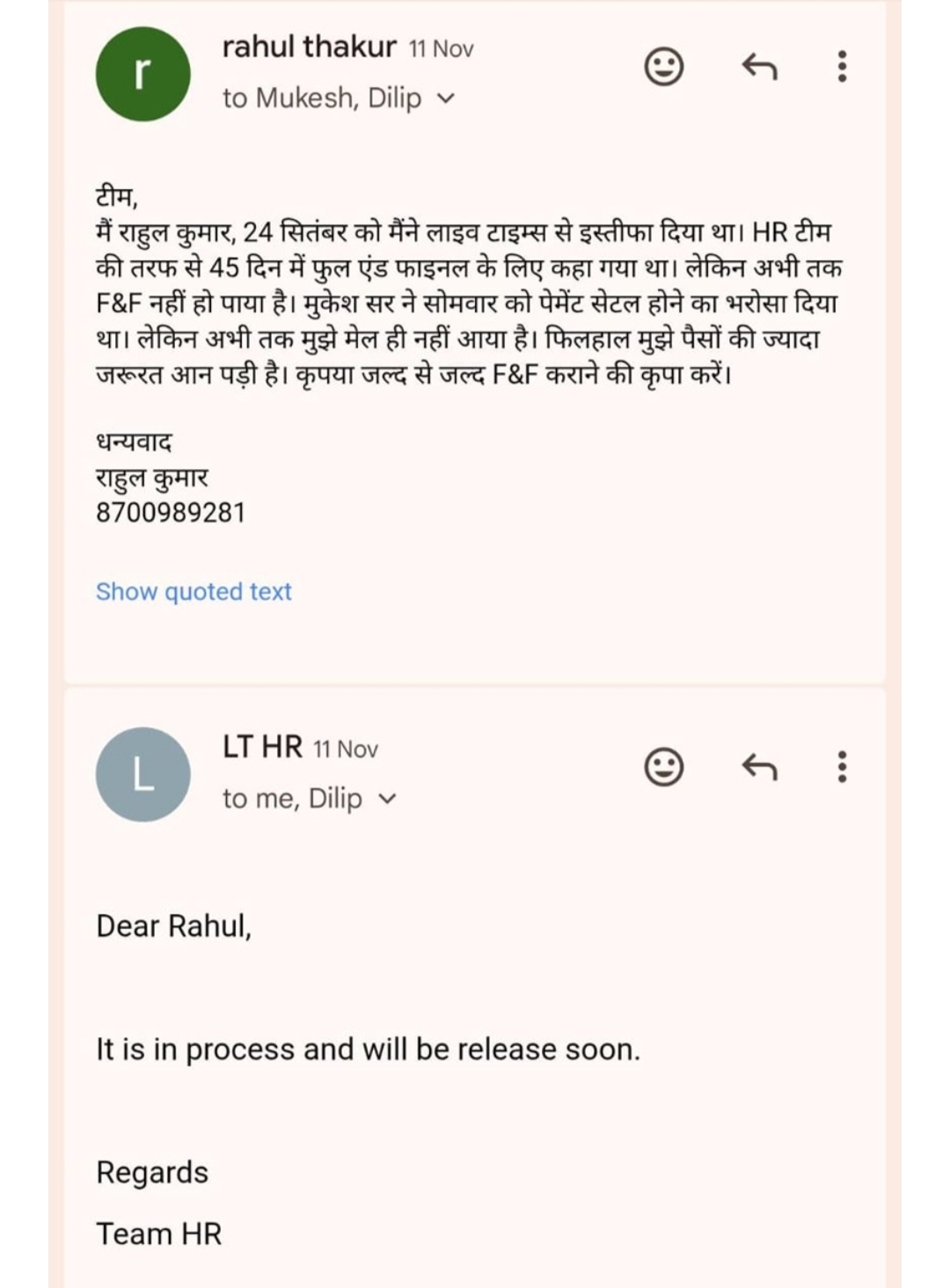 लाइव टाइम्स 80 दिन बीत जाने के बावजूद मेरा मेहनताना देने के बजाय सिर्फ टालमटोल करने में जुटा है। काफी मिन्नतों और बार-बार याद दिलाने के बाद संस्थान ने मुझे फुल एंड फाइनल का मेल भेजा, जिसमें पहले तो इस संस्थान की तरफ से मेरे 22 कामकाजी दिनों पर सवाल उठाया और करीब एक हफ्ते की सैलरी डकारनी चाही। मेरे आपत्ति दर्ज कराने के बाद जैसे तैसे 21 दिनों का वेतन देने पर राजी हुए, वो भी मेरे तीन महीने के दौरान किसी भी PL का भुगतान किए बिना, हालांकि मैंने उस पर भी अपनी सहमति जता दी लेकिन अब इस संस्थान का प्रबंधन मुझे इन 21 दिनों का भुगतान करने में भी हीला हवाली कर रहा है।