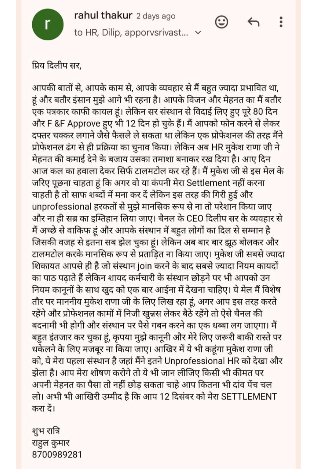मुझे आए दिन आज कल का आश्वासन देकर टाल दिया जाता है, हाल ही में मेरे परिवार में स्वास्थ्य संबंधी दिक्कतें आईं, पैसों की काफी जरूरत की वजह से मैंने तमाम मिन्नतें की लेकिन फिर भी वेतन का भुगतान नहीं किया गया। हालांकि मैं ऐसा पहला शख्स नहीं हूं, इनके बारे में पता करने पर मालूम हुआ कि ये संस्थान कर्मचारी के छोड़ने पर उसके हक की कमाई पर ऐसे ही डकैती डालता आया है। बहुत से लोग हफ्ते दस दिन की सैलरी छोड़कर उलझना नहीं चाहते लेकिन मैं अपनी मेहनत का एक रुपया ऐसे डकैतों को हजम नहीं करने देना चाहता।