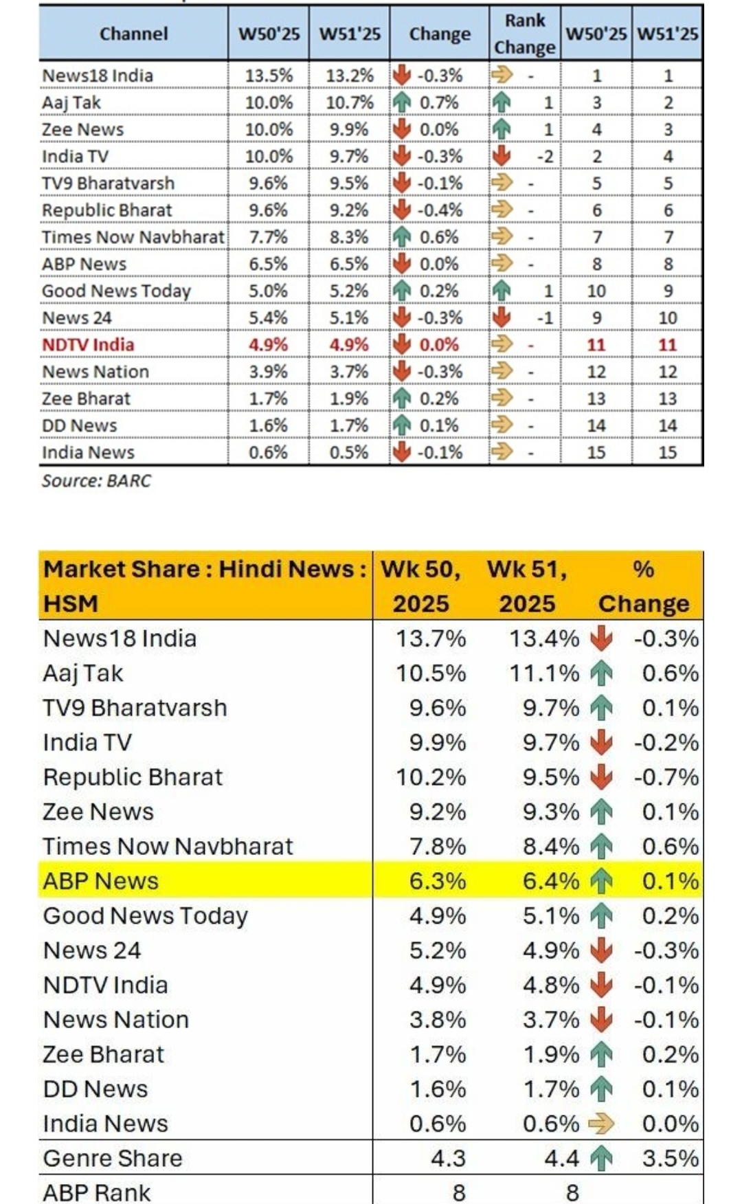 हिंदी न्यूज चैनलों की 2025 के 50वें और 51वें सप्ताह की टीआरपी रिपोर्ट सामने आ गई है। आंकड़ों के मुताबिक इस हफ्ते न्यूज मार्केट में मामूली लेकिन अहम उतार-चढ़ाव देखने को मिला। जहां कुछ बड़े चैनलों ने अपनी पकड़ मजबूत की, वहीं कई चैनलों की हिस्सेदारी में गिरावट दर्ज की गई। अदानी चैनल ‘एनडीटीवी’ लगातार फिसड्डी बना हुआ है।