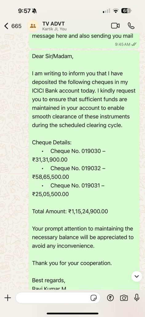 खबर जयपुर से प्रसारित सच बेधड़क न्यूज चैनल से हैं यहां कुछ दिन पूर्व Media4samachar ने स्टॉफ को वेतन न दिए जाने से संबंधित खबर को प्रकाशित किया था उसके बाद चैनल प्रबंधन व चेयरमैन विनायक शर्मा ने खबर का संज्ञान लेते हुए 1 करोड़ 15 लाख की बैंक चेक जारी किया जिसको बैंक में लगाएं जाने के बाद सभी चेक बाउंस होने लगें कारण ये था की बैंक बैलेंस में इतना अमाउंट ही नहीं था और चैनल मालिक ने फर्जी बैंक चेक जारी कर दिए ऐसे चैनलों में पत्रकार जाने से बचे और न ही अपना भविष्य बर्बाद करें