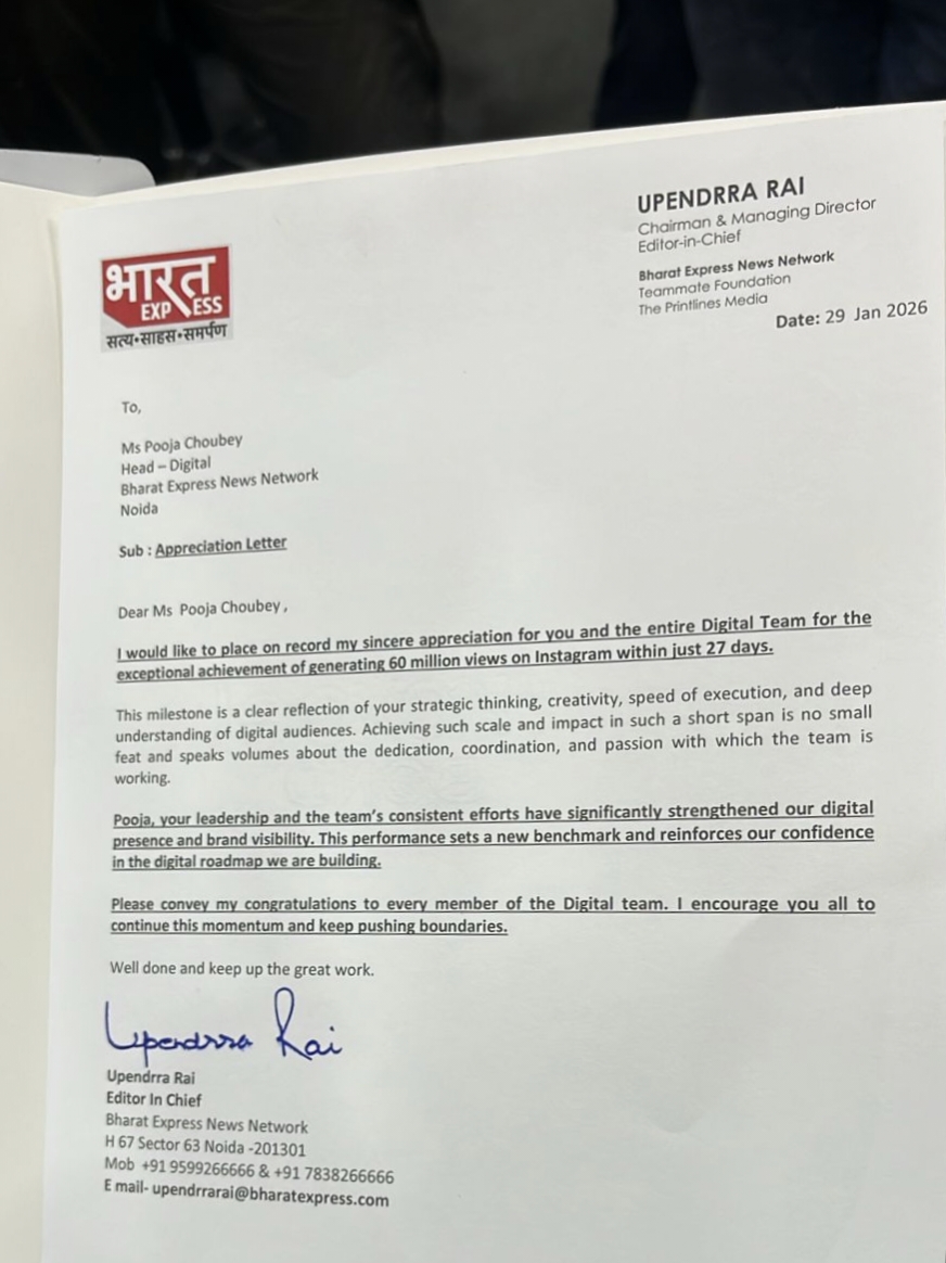 नोएडा: भारत एक्सप्रेस न्यूज़ नेटवर्क की डिजिटल टीम ने अपनी कुशल रणनीतिकार और हेड पूजा चौबे के नेतृत्व में एक अभूतपूर्व सफलता दर्ज की है। चैनल के इंस्टाग्राम हैंडल ने महज 27 दिनों के भीतर 60 मिलियन व्यूज का जादुई आंकड़ा पार कर लिया है, जो डिजिटल मीडिया जगत में एक मिसाल है।
