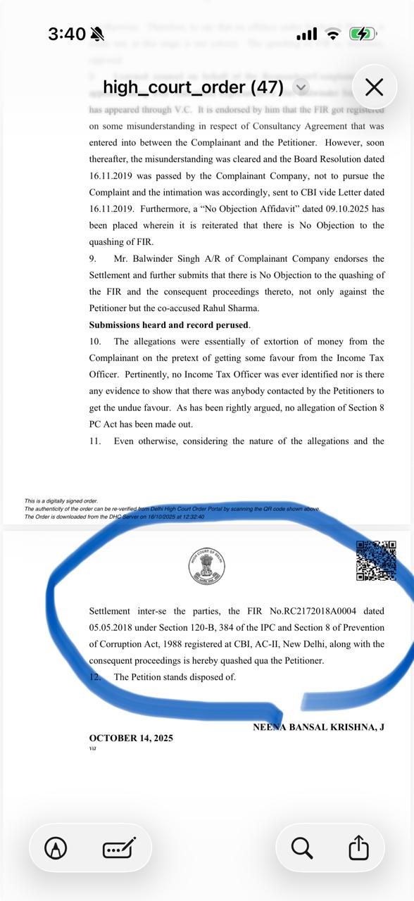 न्यायमूर्ति नीना बंसल कृष्णा ने अपने आदेश में CBI एफआईआर और उससे संबंधित सभी कार्यवाहियों को निरस्त कर दिया और लिखा कि इस मामले में “न तो भ्रष्टाचार निवारण अधिनियम की कोई धारा लागू होती है, और न ही किसी अपराध का तत्व.” इसके साथ ही अदालत ने याचिका का निपटारा करते हुए मामले को समाप्त कर दिया।