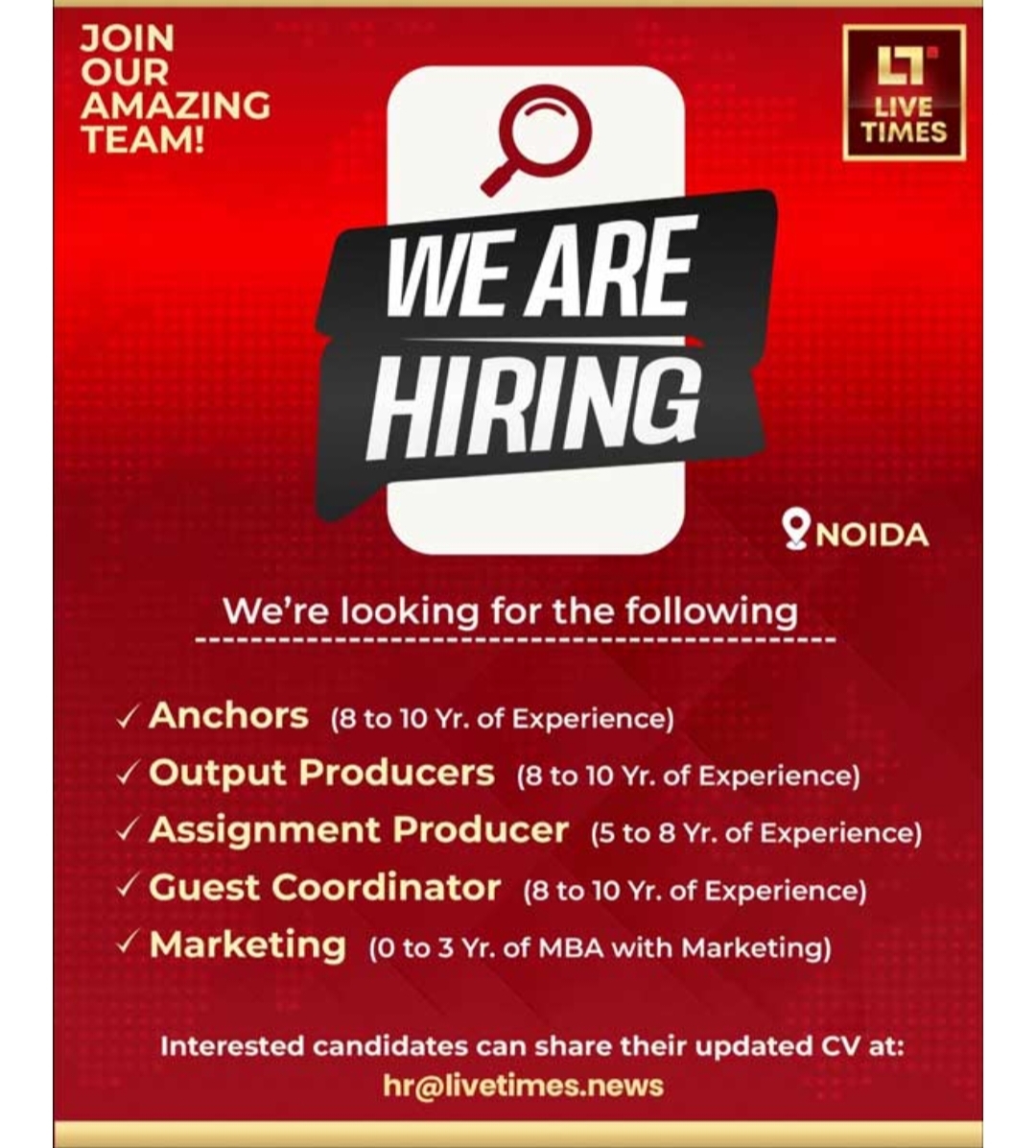 ये सभी नियुक्तियां नोएडा के लिए होनी हैं। इन पदों पर काम करने के इच्छुक आवेदक अपना अपडेटेड रिज्युमे hr@livetimes.news पर भेज सकते हैं। इस बारे में सोशल मीडिया पर शेयर विज्ञापन आप यहां देख सकते हैं।