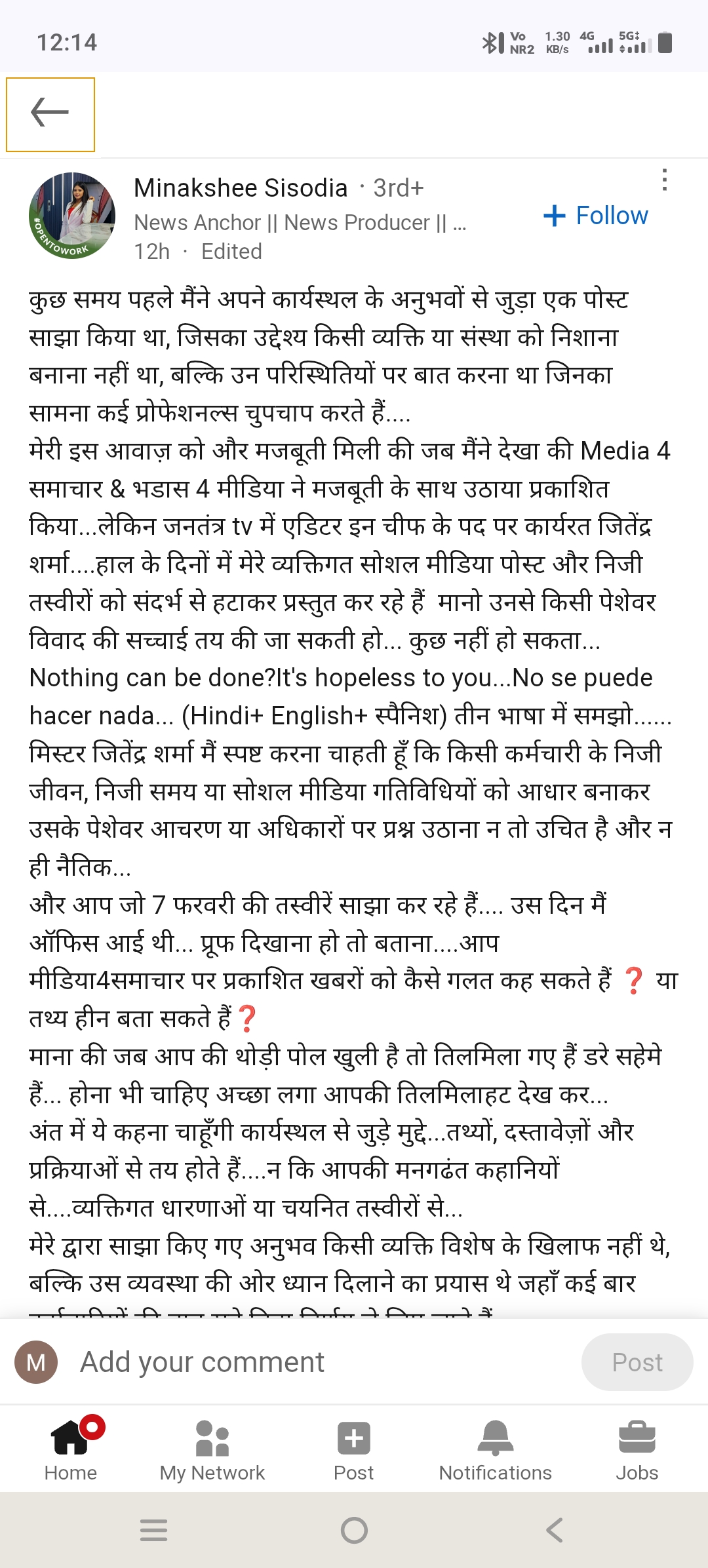 महिला पत्रकार ने जितेंद्र शर्मा को सार्वजनिक रूप से चुनौती देते हुए कहा कि किसी कर्मचारी के निजी समय या सोशल मीडिया पोस्ट को संदर्भ से हटाकर पेश करना उनके पेशेवर दिवालियेपन को दर्शाता है। उन्होंने स्पष्ट किया, “किसी कर्मचारी के निजी जीवन को आधार बनाकर उसके पेशेवर अधिकारों पर प्रश्न उठाना न तो उचित है और न ही नैतिक। कार्यस्थल के मुद्दे तथ्यों और प्रक्रियाओं से तय होते हैं, आपकी मनगढ़ंत कहानियों से नहीं।”